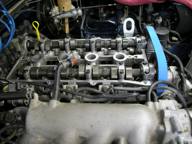 Then the new timing belt was installed. We chose a Gates Racing version for its durability. Since the owner doesn’t put a lot of miles on this car durability is just as important as if it were a high mileage track car. We also replaced the idler and tensioner pulleys. The idler pulley bearings were worn in any case. With the cams and crank lined up, the tension set, everything was snugged down and the parts and pieces were put back on.