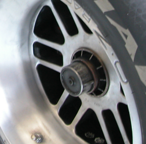 Notice the air gun that’s used. The “nut” that’s used to hold the wheel on is not your usual nut with six sides. Instead it has flutes that the air gun’s wrench can grab hold of. The right side of the car has left hand threads so the gun has to be set to spin clockwise to remove the nuts and the left side of the car’s hubs have right hand threads so the guns will spin the nut counter-clockwise to remove them.