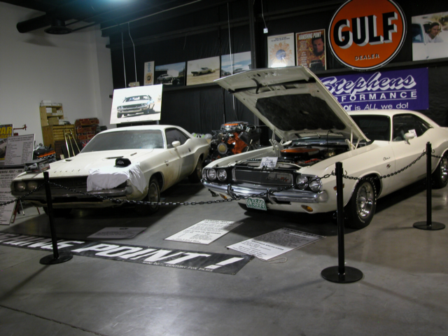 There was an exhibit of the Dodge Challengers used in the 1996 re-make of “Vanishing Point”. One was used as the stunt car and has beeen left with all the dirt and scars on it while the other was the “pretty” car for all the important close ups.