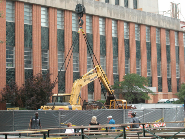 Then I went around to where the action was taking place. Well, sort of taking place. For the moment the crane that was to lift everything out of the hole it was buried in was just sitting there. Tomorrow at noon the VIP’s get to view the actual event while others get to see it live on a video screen in the Maxwell Convention Center just a couple of blocks away.
