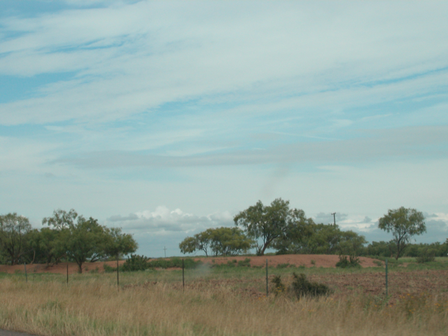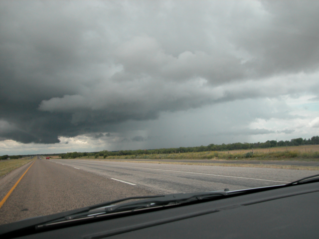 Later, as I drove deeper into Texas, the panorama allowed me to see that there was some very stormy weather off to my right and my left. On the left I could even make out the start of funnel clouds. The weather stayed pretty much at my 10 and 2 o’clock positions except when the road would turn and rotate me toward one or the other system.