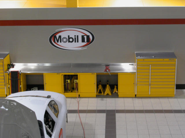 The floor was tiled and spotlessly clean. Each area was laid out as efficiently as possible with plenty of bench surface and cabinet space. Drawers were not left open and tools were not accumulating on the floor. Air hose reels were tucked under the benches and there were cubbies for the jack stands. Each team’s area was color coded to highlight the sponsor as well as the driver.