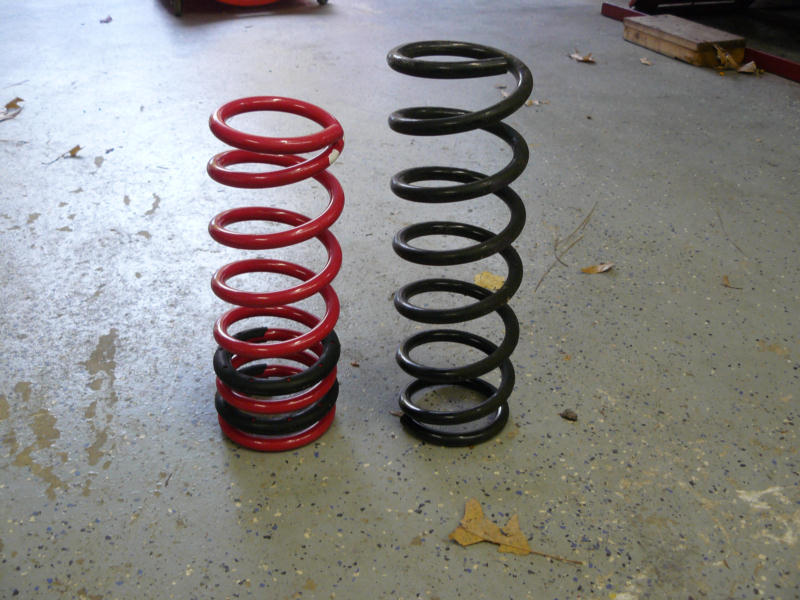 Once again, the new springs were considerably shorter than the originals which made installation with the spring compressor just as easy as with the front struts. Here are some shots of the springs prior to mounting.
