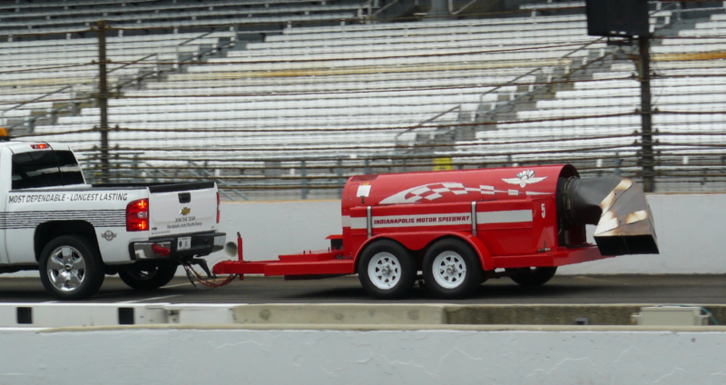 I arrived at the track early on Tuesday morning, optimistically dressed in a polo shirt and jeans. It soon became evident that things were not going to warm up at the track and the wind was persistent. Soon trucks would be circling the track along with the one that towed the dryer. The dryer consists of a turbine engine on a trailer with a nozzle facing the track blowing the hot exhaust across the surface and ridding it of moisture.