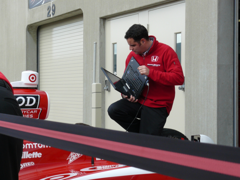 After alignments are set the car is jacked up and the Honda tech’s arrive for the engine startup and transmission check. Honda supplies all the engines for all the cars in the race series. They have their technicians rotate through all the teams with the goal being that all the engines are as equal as possible and reliable. The engines are naturally aspirated and computers play an ever-present role in the startup, testing, and tuning. ThinkPad laptops were the choice for the Honda technicians and they kept their eyes glued to the screens as the engines were started and the transmissions were taken through the gears. These are six-speed gear boxes that are controlled via paddle shifters on the steering wheels. As the cars went up in the gears the engines revved with small blips of the throttle and when they went down the gears there was a pop as each selection was made and a bit of the ethanol fuel was left to explode in the exhaust.