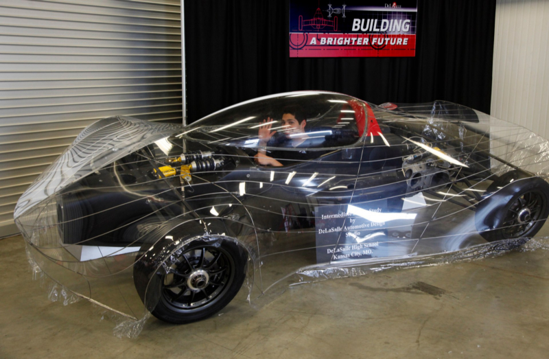 You turn it over to seven students from Kansas City’s DeLasalle Charter High School along with 11 mentors who worked for eight months to transform it into a full-bodied, electric powered car that gets an equivalent 300 miles per gallon.