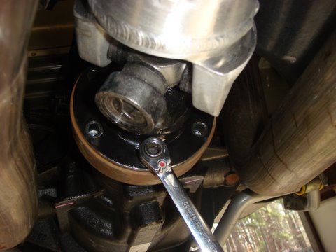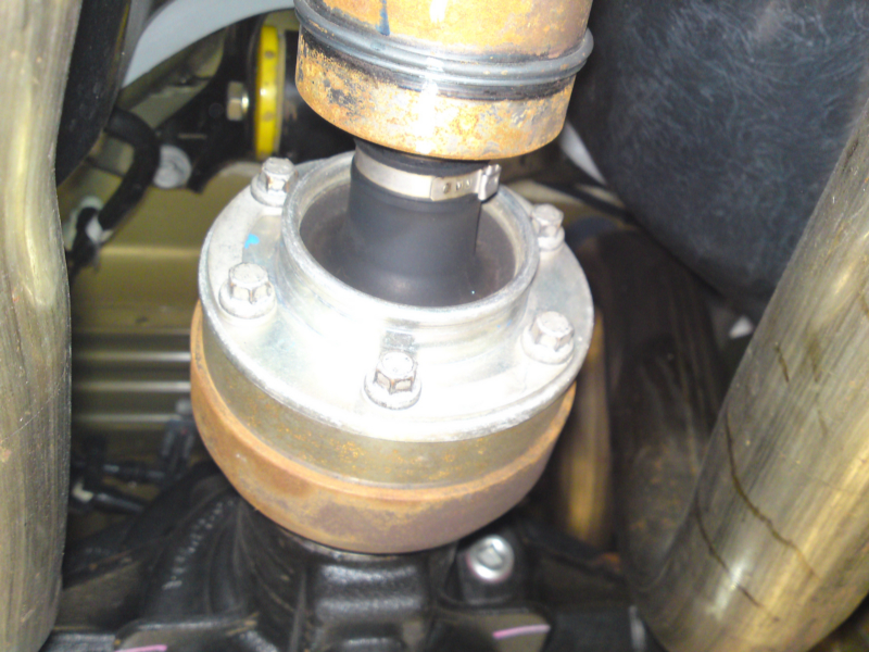 We stretched the joint so that the rear flanges would meet enough for us to get the two bolts snugged up. Then we applied Vibra-tite to the other four bolts supplied in the kit and bolted them up to the rear. The two bolts we first put in were removed and had their threads coated with Vibra-tite as well before they went back in.
