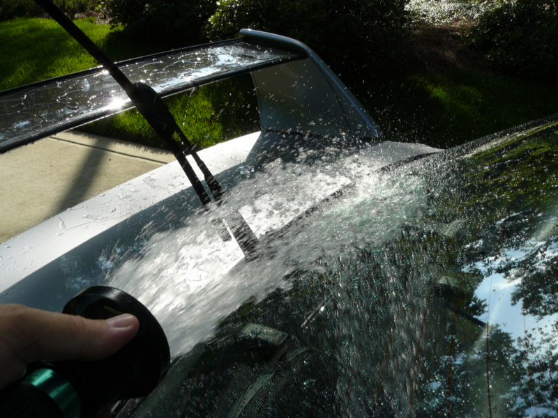 Find a shady spot to park your car or truck in and drag out your hose. Make sure that all the windows are closed up tight and flip the windshield wipers off the glass. Turn on the water and give the vehicle a good rinse. Start with the top and work your way down. The bugs on the front will need a couple of blasts. One to soak and loosen them, then another blast to get them off. As you move down the car body you will notice that there is more dirt on the bottom than the top. Keep that in mind when it comes time to wash with soap.