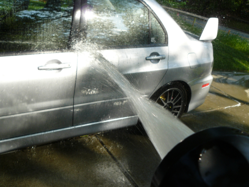 You will use a broad spray on most of the body and then a concentrated fine power point of water around the wheels and brakes. Rinse the wheel wells of stuck on dirt and mud.