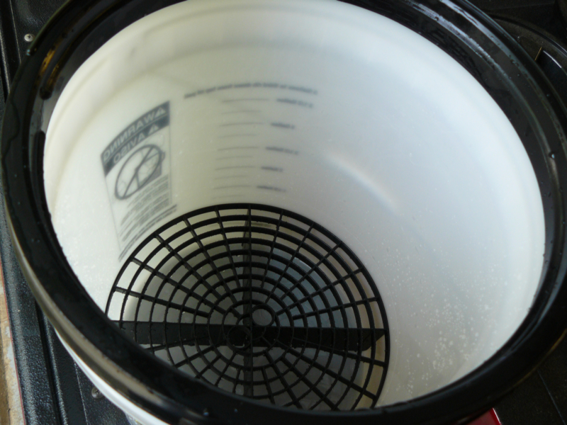 The rinse and wash buckets that I’m using now have a grid on the bottom so that I can scrub the wash mitt against the grill and get grit and grime off the wash mitt. The heavy stuff stays below the grid and doesn’t end up rubbed on the paint finish leaving scratches. The bottom part of the bodywork is usually really dirty and it is best to wash in smaller sections so that the wash mitt can be rinsed clean of grit – again, to keep from scratching the paint unnecessarily.