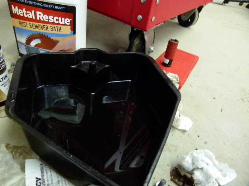 When items that were going to be reused were rusty they were thrown in a bath of Metal Rescue. It is a great product to use since it only attacks rust. It is water based and is biodegradable. It is safe to use without gloves although it doesn’t hurt to wear them. You can get most parts clean of rust in two to four hours of soaking, but the hard stuff may take over night. It can be used over and over again.