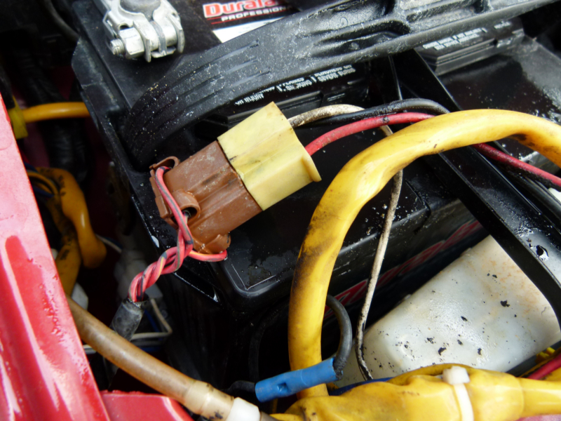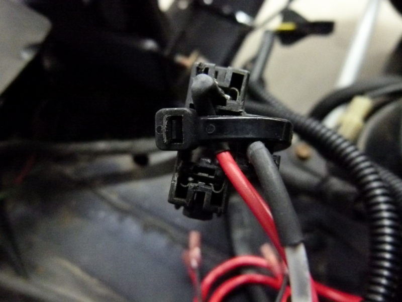 First off I was to plug a couple of wires of the harness into one of the stock headlight connectors. Hmm. The wires just had male spade connectors crimped onto them. They wouldn’t stay in place unless I held them with a nylon tie wrap.