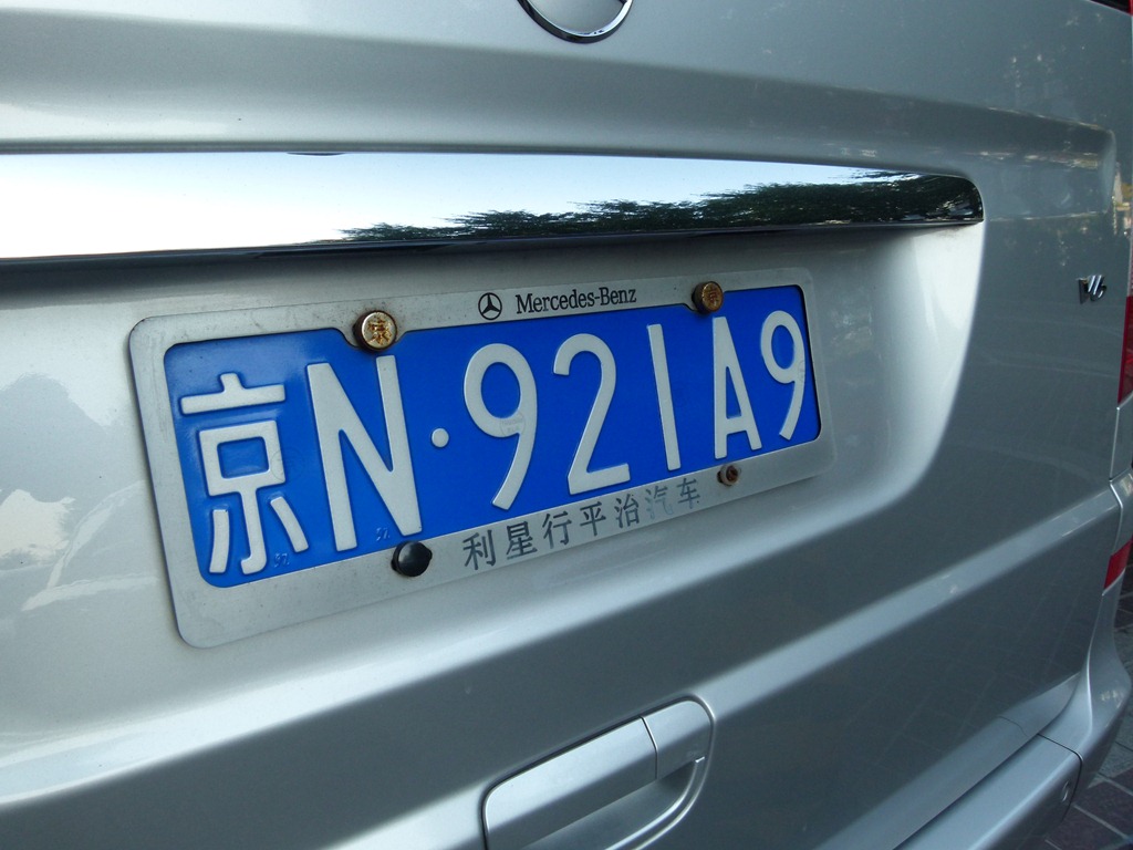 The above is a Beijing license plate. The character on the left is the symbol of Beijing. The background color is blue, with white being for army or military vehicles. The most favored color for cars is black. Probably because it was the traditional color for government vehicles and has an aura of importance.
