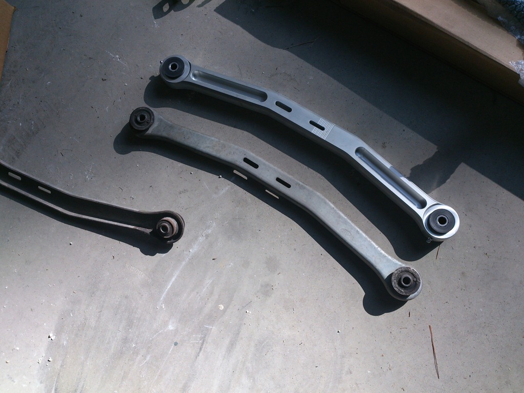 First came the control arms and here you can see the difference in the construction of the pieces, stock vs. new: