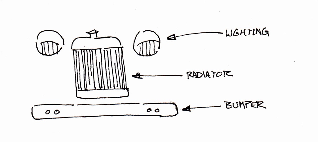 There are variations, to be sure, but the basic layout is almost always the same. In the early days of cars the front ends had a distinctive radiator out in front because the heat generated by the engine had to be dealt with. Headlights were on either side and then underneath was a bumper that stood out from the body and fenders. Like this: