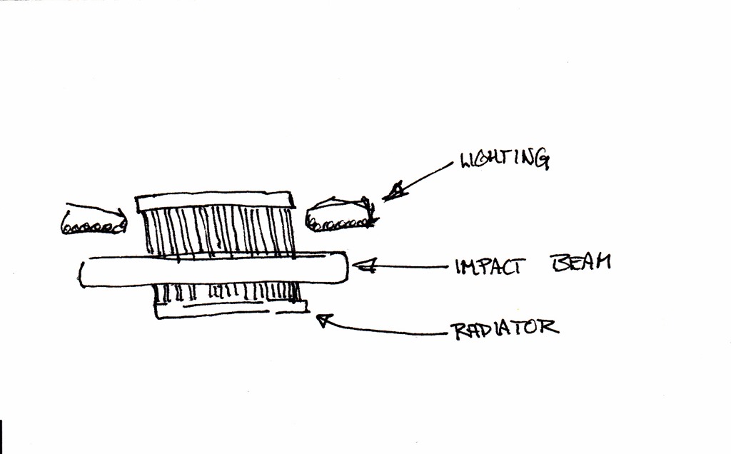 In the modern era we have dispensed with separate bumper and instead have a crash beam covered typically with a polyurethane “bumper cover”. The radiator is behind the beam and a pair of stylized headlights are on either side of the radiator that is still there to get rid of the heat generated by the engine, but is tucked in behind a grill, like so: