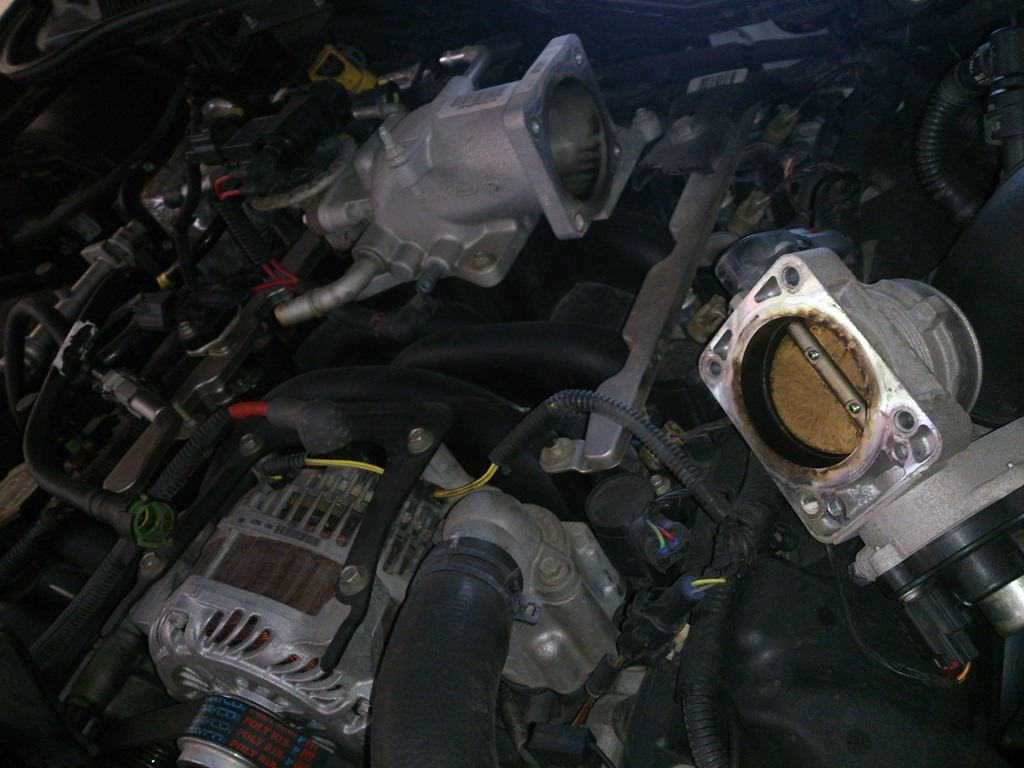 The job of swapping it out for the factory unit was fairly simple. I disconnected the hose between the air cleaner and the throttle body and then broke loose the two bolts holding the EGR valve to the plenum. Then the four bolts that held on the throttle body followed by the five that held on the plenum itself. Prior to that I had several hoses to disconnect.