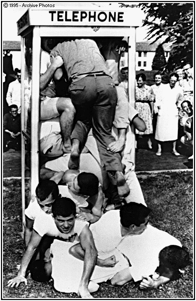Anyway, back in the dark ages of the 1950’s and 1960’s there was no Internet or game boxes so teens would think of things like – How many of us can fit in a phone booth? So they would try it. They would jam like twenty kids into a booth. It looked like pickles in a square jar.
