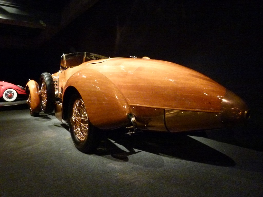 The wooden beauty above is a 1924 Hispano-Suiza custom bodied for the Dubonnet family of cognacs fame. It was built of tulipwood veneer about 1/8 of an inch thick over wooden framework and fastened with hundreds of copper rivets. Supposedly the body weighs about 160 pounds.