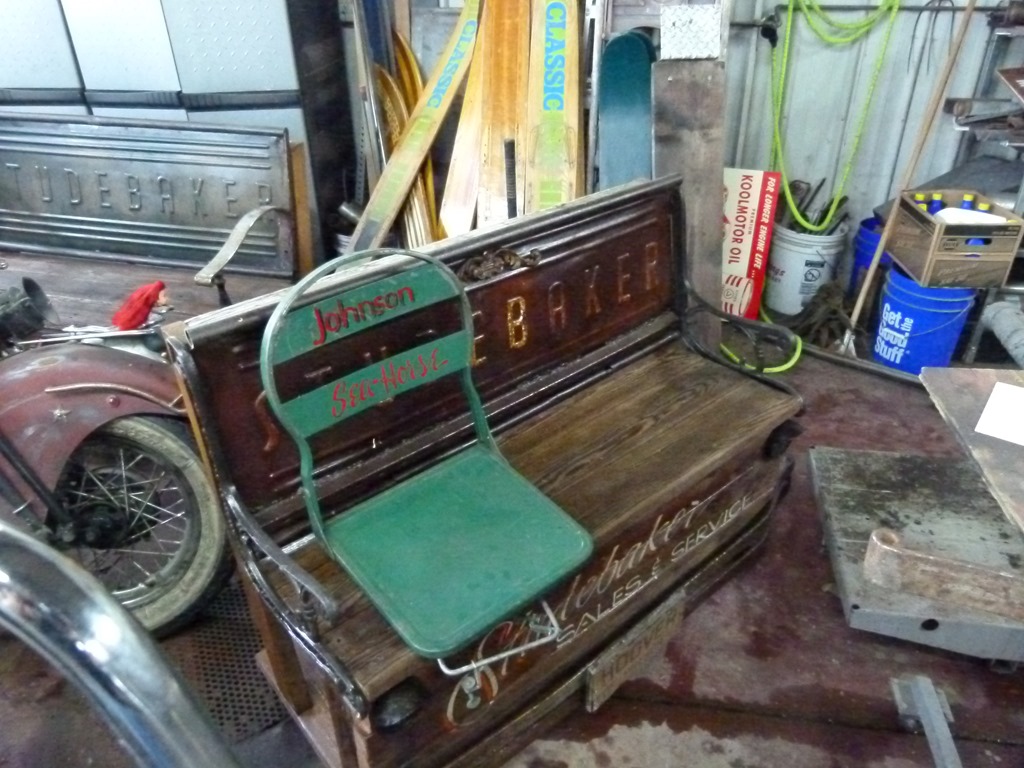Now you purists might well be shocked by the conversion of Studebaker tailgates into benches, but understand that the tailgates used here were all that was left of the original pickup trucks and you can see that upper photo of the tailgates, a previous owner had welded a signpost to the bottom part in order to reinforce it. So try to appreciate that this creativity has saved what would have been a discarded or recycled piece of steel and allowed it to continue to exist as a stunning piece of art – that is also functional.