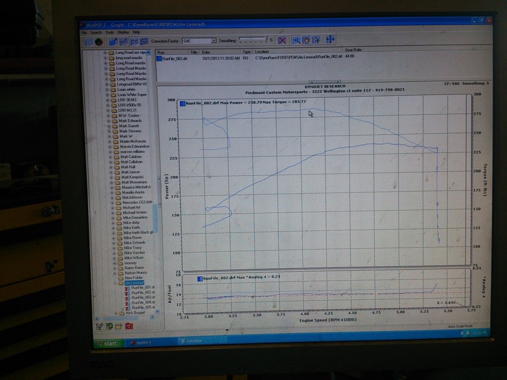 This morning I took a trip over to Piedmont Custom Motorsports so that I could get the P71 on a dyno and have it tuned. The modifications that I’ve done were not a lot, but they were substantial in terms of maximizing the potential of the naturally aspirated 4.6 liter V8. The Stainless Works long-tube headers, the 2.5” Stainless Works exhaust and hi-flo cats. The ported intake elbo from ADTR.net along with the Steeda under drive pulleys. These all changed the potential and the guys at Piedmont Custom Motorsports put the P71 up on a dyno and did their magic. The display says it all.