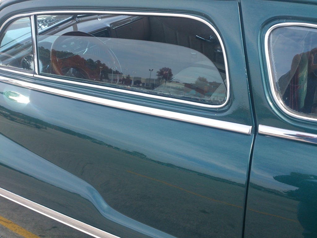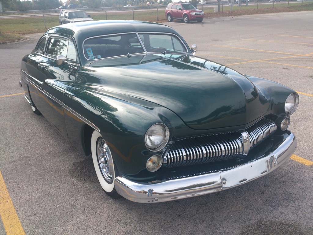 A 1950 Mercury that has had all the “right” stuff done. Chopped, channeled, shaved door handles, with Frenched radio antennae.