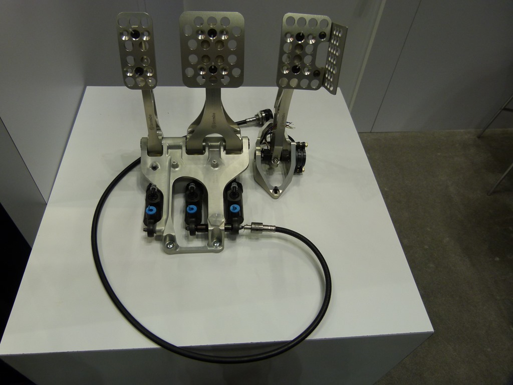 After waving my arms and doing my best to get someone’s attention a guy finally came over to me. I asked him to tell me about it and it was really interesting. You see the cable there? The knob on the end allows the driver to adjust brake bias on the fly. The cylinders with the blue plastic on top? They are the master cylinders! Now that is impressive. I mean, look at the size, they are tiny compared to what I am used to seeing. The aluminum assembly was gorgeous, and the pedal faces were designed to be easily moved around in order to configure them for clearance and driver preference. I found it a beautiful piece of engineering and design. The Brembo display was just so minimalist and the staff acted barely approachable. Must be an Italian thing.
