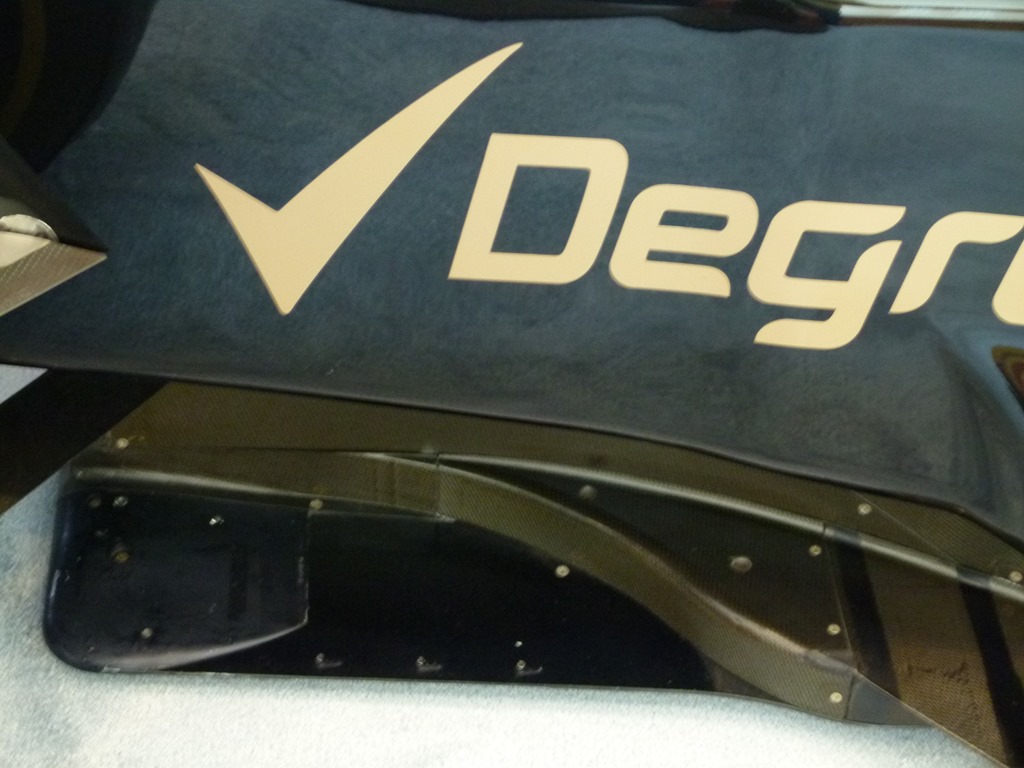 The metal skid plate on the bottom and a view of the tunnels at the rear that produce the downforce.
