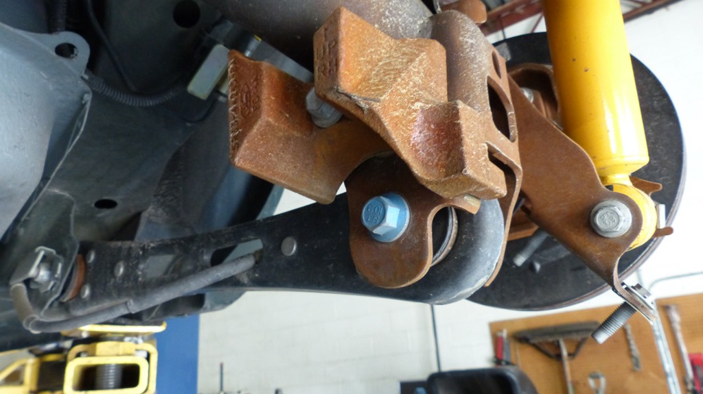 Before the new control arms go in place a set of new brackets were bolted in to lower the axle mounts for the new control arms. First the axle weights were unbolted.
