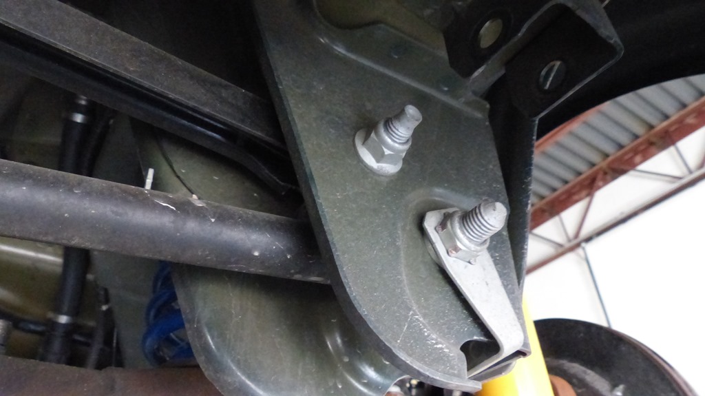 After removing the factory front bar, end links, and the bushing clamps a pair of brackets were put in place using the stock studs.