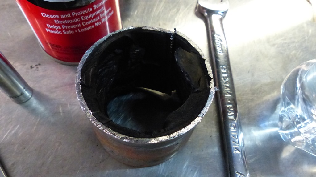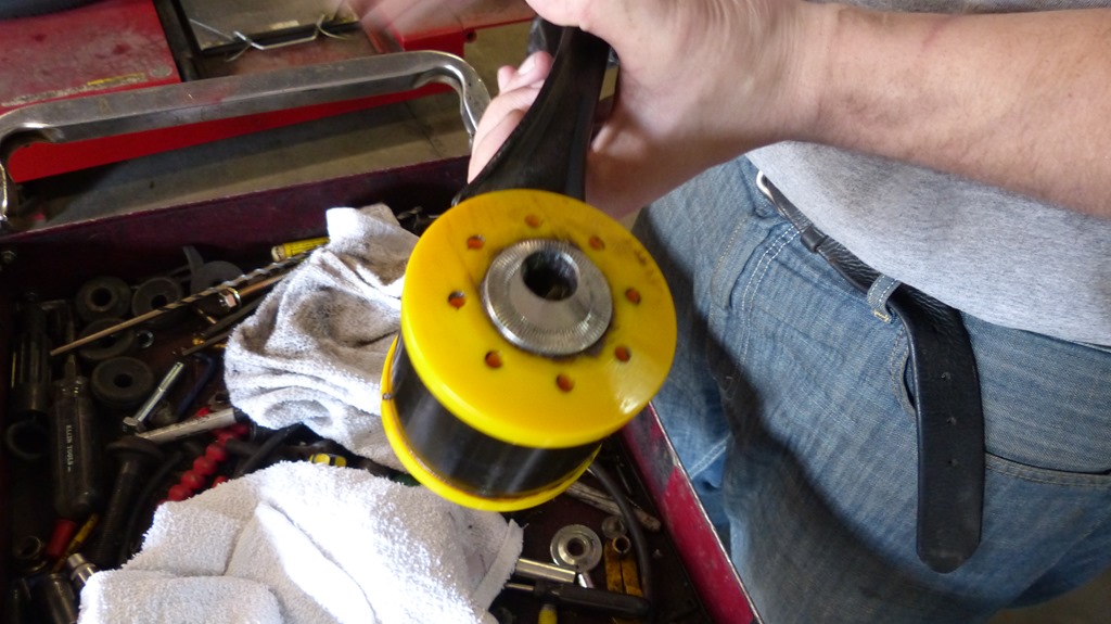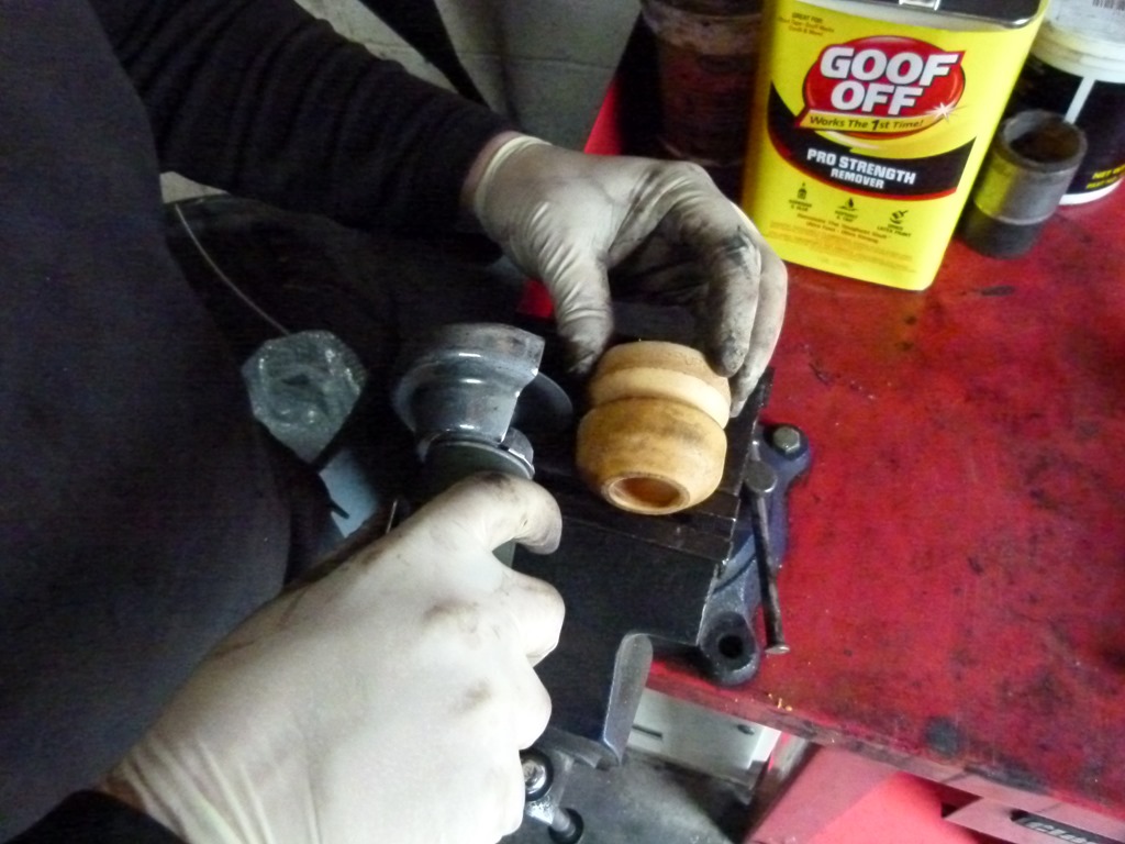 First the rim on the factory bushing was first cut off so that the bushing could be put in the press. The rubber center section was ripped out with the press and then the steel ring was cut with a slit so that it could be removed from the arm in preparation for the new yellow bushing and steel offset inner bushing that is the key to being able to adjust the pinion angle.