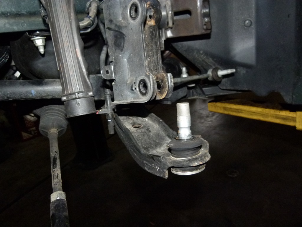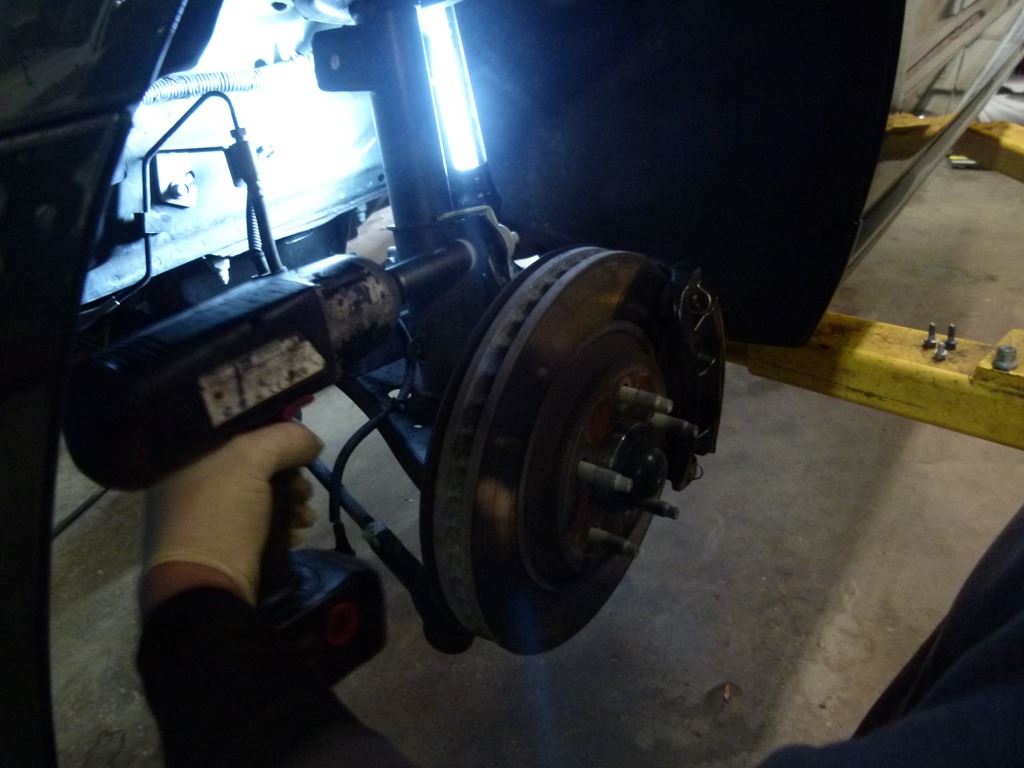 Soon it was time to take the front suspension apart. That meant unbolting the top of the strut and then unbolting it from the steering knuckle that is connected to the control arm. Then removing the control arm itself.