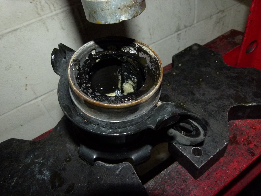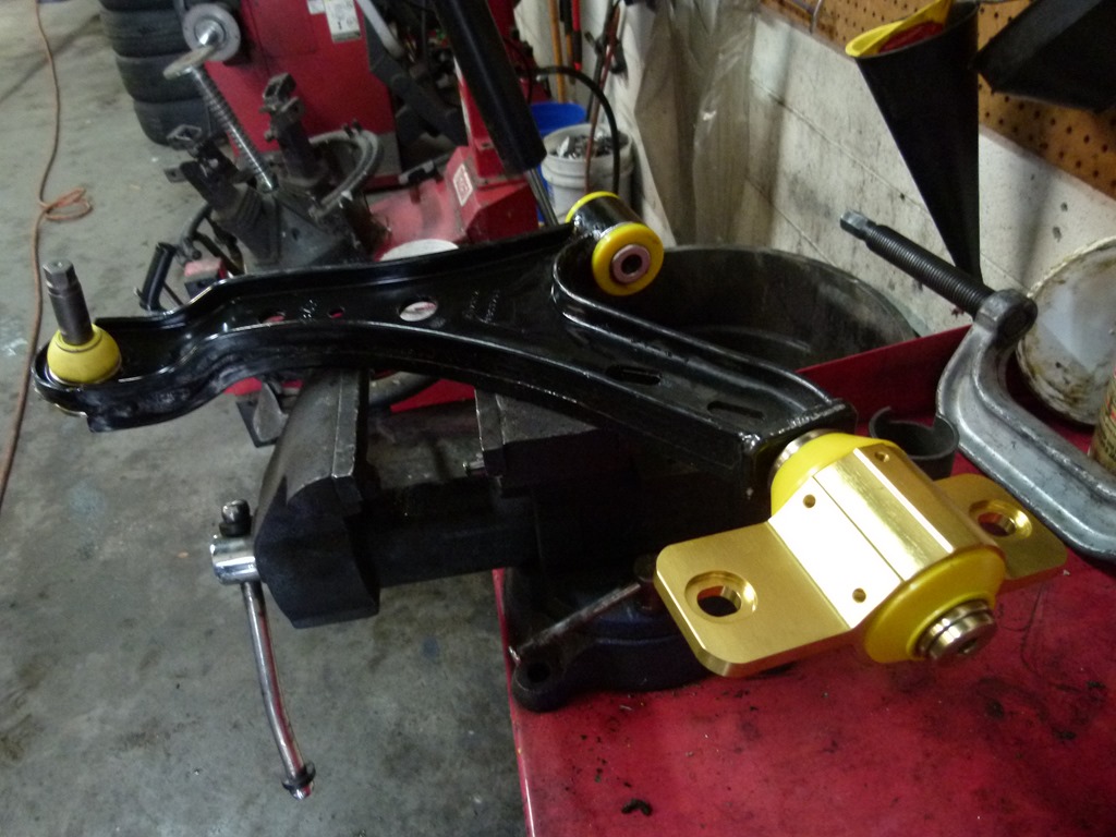 The control arm has the inner pivot pressed out. This is a messy job since the stock pivot is fluid filled.