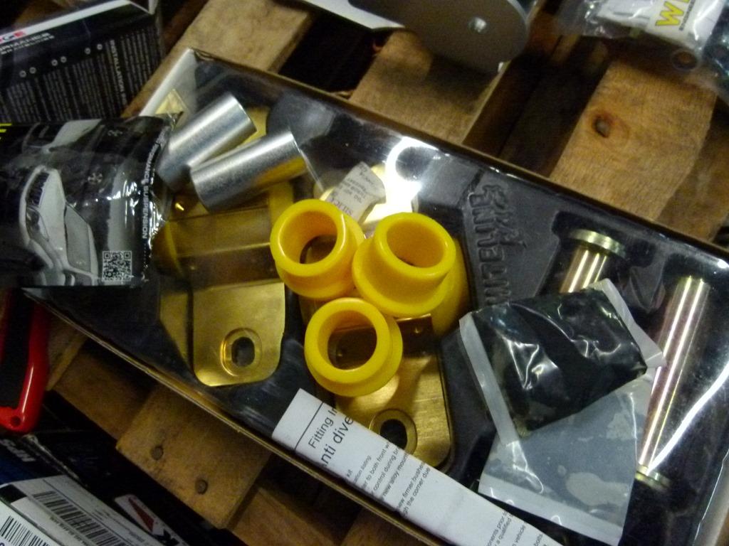 Whiteline makes an adjustable front sway bar (aka: anti-roll bar) along with a brace that tightens up the front frame. This customer also got the optional adjustable end links for the new sway bar.