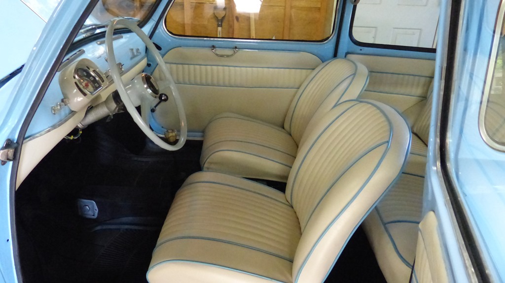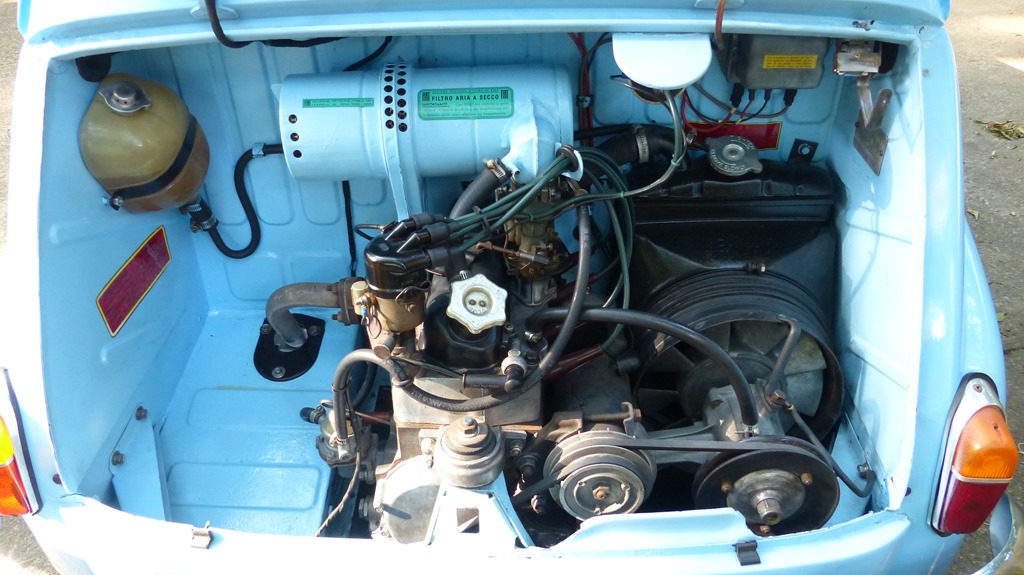 The Fiat 600 was a big brother to the Fiat 500 of the 1950’s and 1960’s, and it was full of much more in the way of upgrades. Its engine was not only larger (633 to 767cc inline four cylinder) but unlike the Fiat 500, it was water cooled. It had four wheel hydraulic drum brakes and the early ones had suicide doors. The front suspension was a single double-mounted leaf spring that acted as a stabilizer as well. The rear suspension was coil-over springs and shocks with trailing arms.
