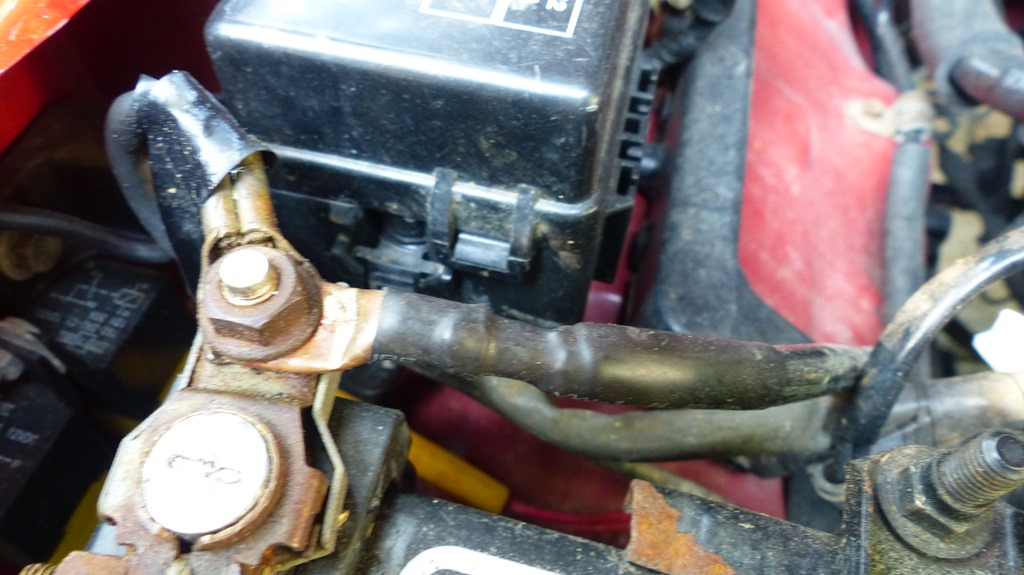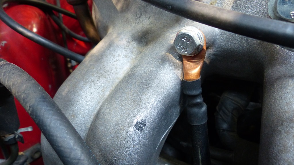 I had decided to enhance the grounds between the engine block and the chassis. I thought that it might improve the engine’s smoothness and performance, which it did. It also made the intermittent speedometer act normal. My grounds went from the negative terminal of the battery to the intake manifold and from the valve cover to the firewall. These were 4 gauge and 8 gauge wires with serious terminal lugs.