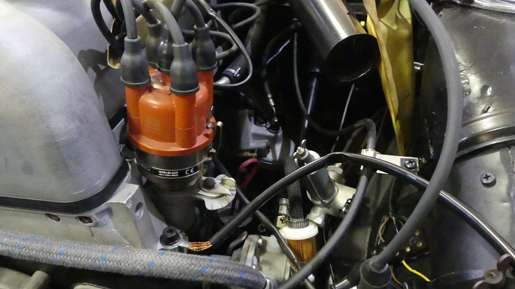 The battery looks like a lead-acid style right from the 1960’s, but is actually a modern sealed unit in disguise. The distributor is converted from points and condenser with advance weights and springs to a unit that looks the same but is all electronic.