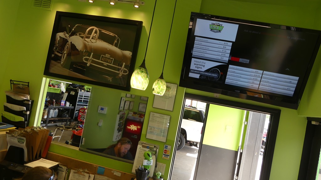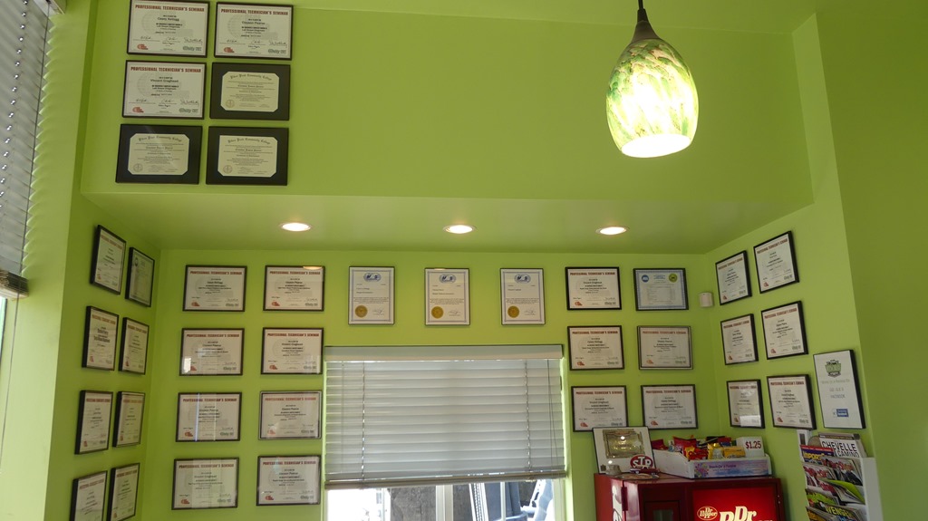The customer greeting area is colorful and inviting with plenty of certifications on display.