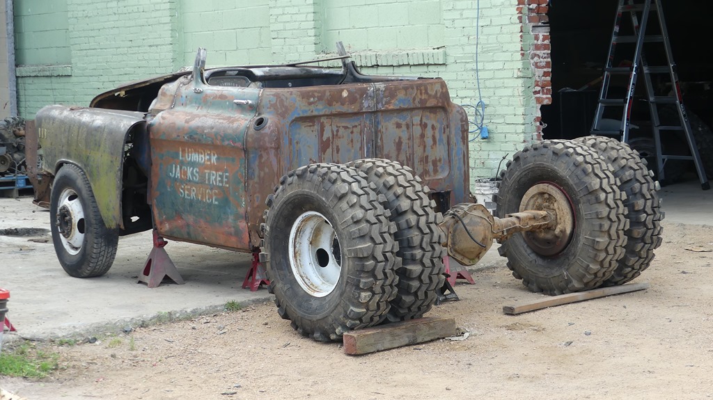 A ‘57 Chevy wagon on a truck chassis. Simply amazing. Notice how a ‘57 hood was repurposed as fenders for the dualees. This is heavy duty.