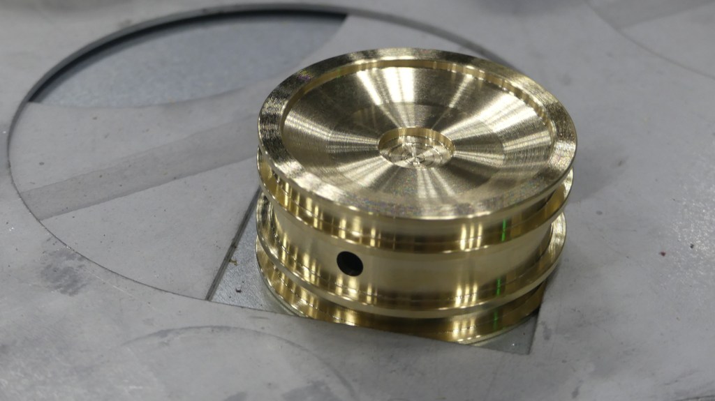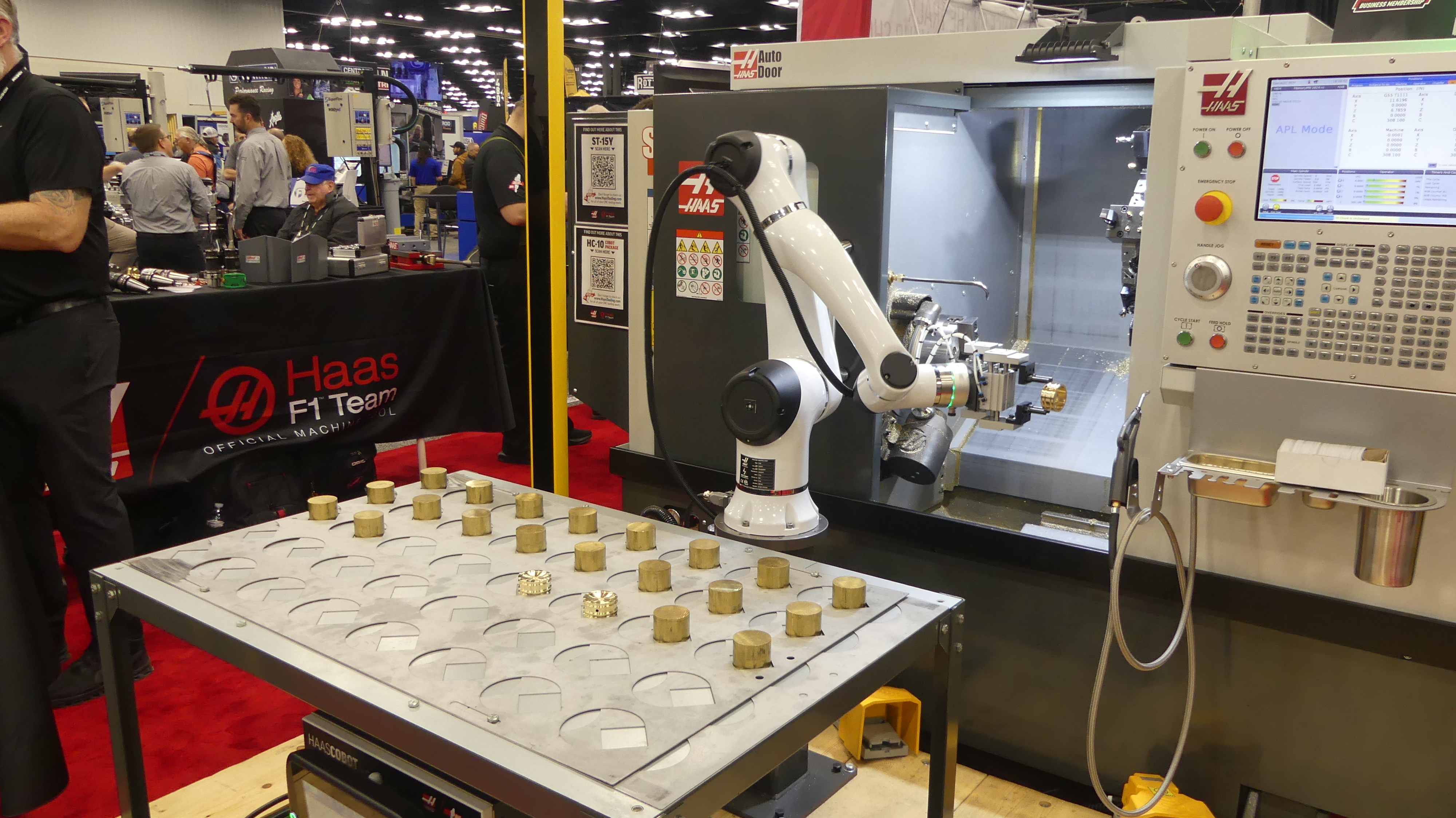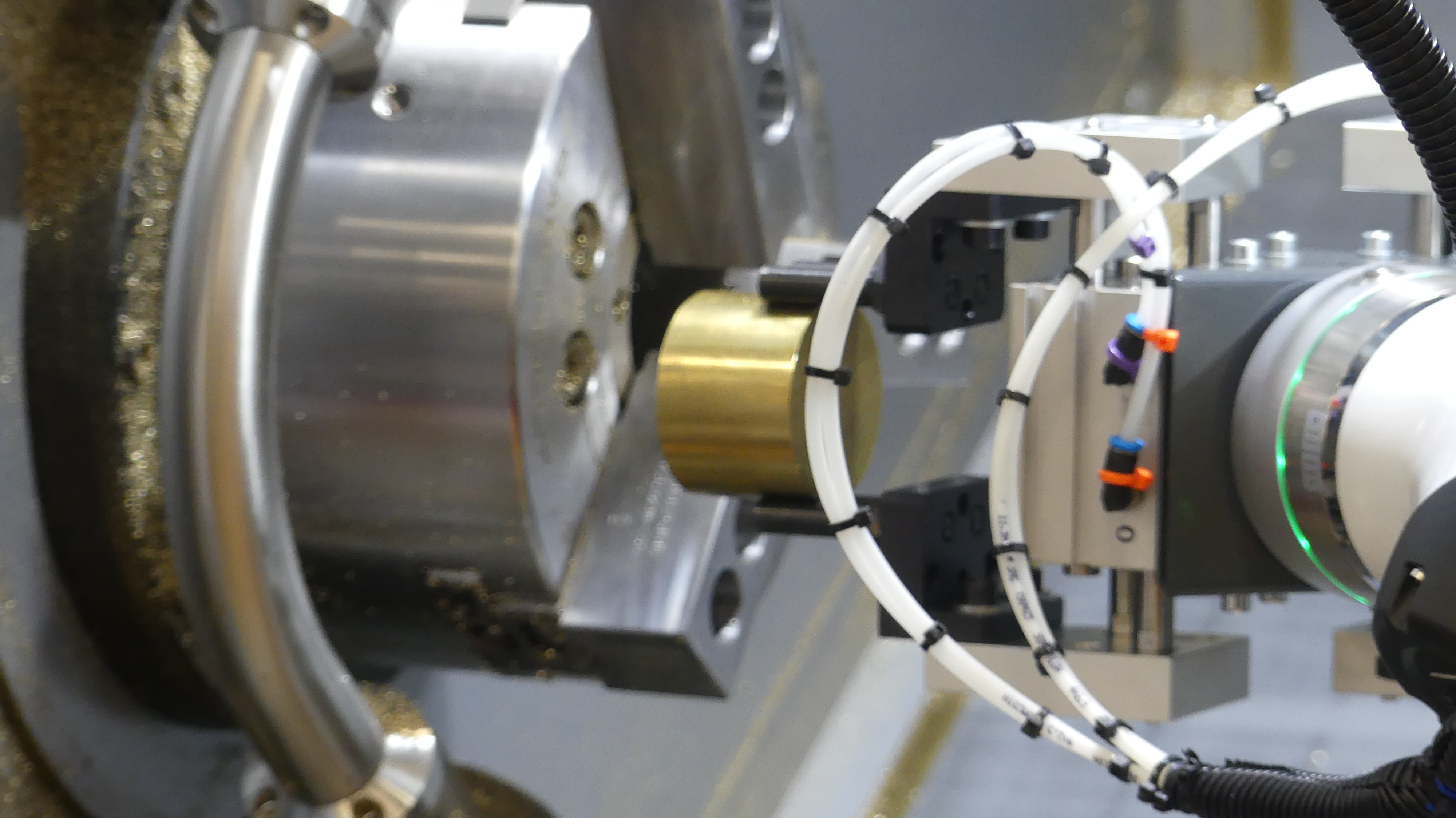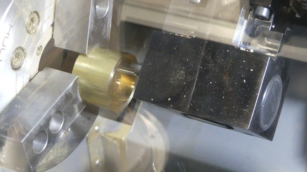 Their automated machines are also impressive. This one takes brass blanks and robotically positions them in a lathe chuck and then does precise machining. When the process is done on a piece, then the robot arm loads a new blank as it collects the completed part and positions it back on the tray.