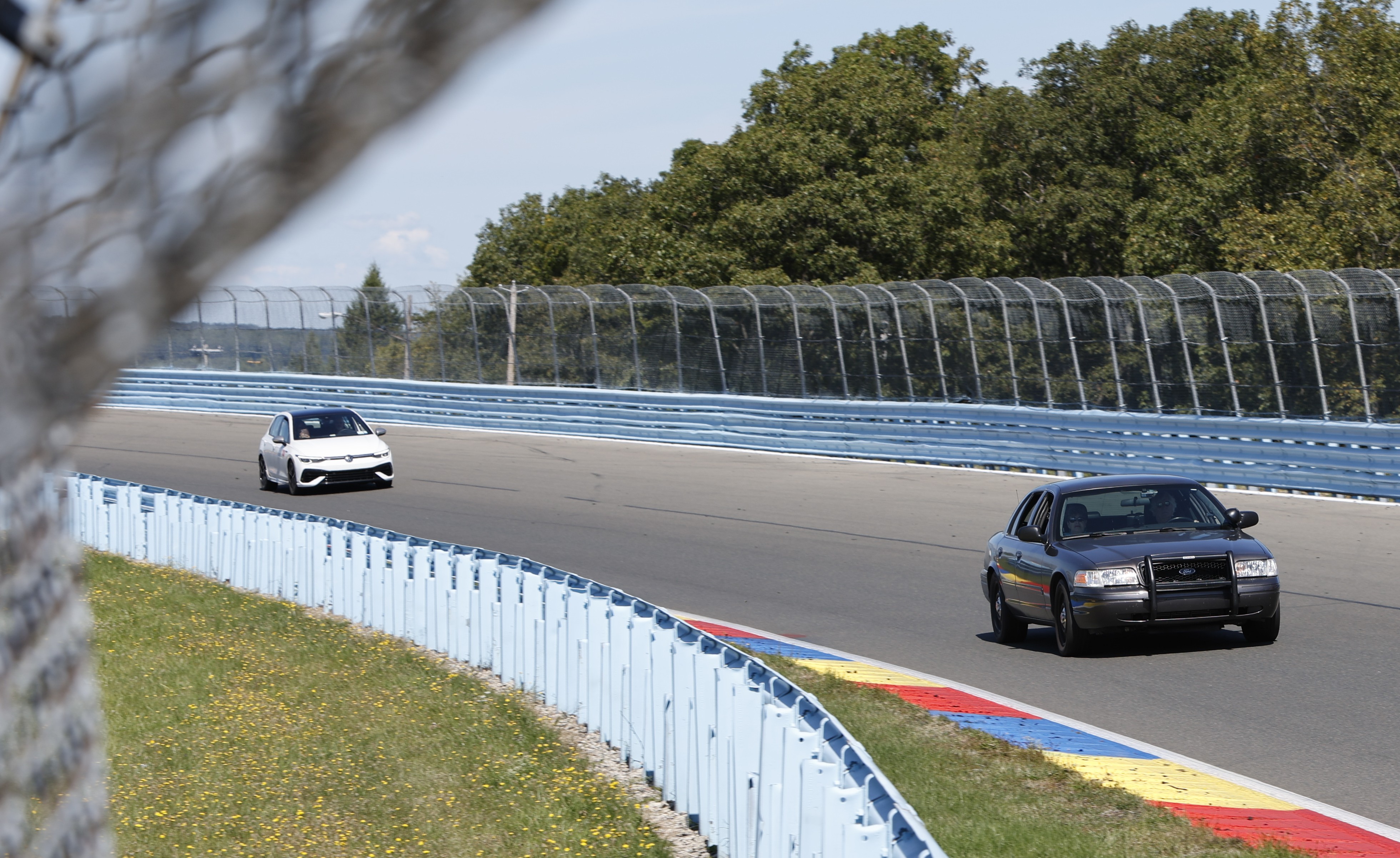 Here we are in our Ford (retired) cop car. It was a real hoot to get it on the track at something close to racing speeds.