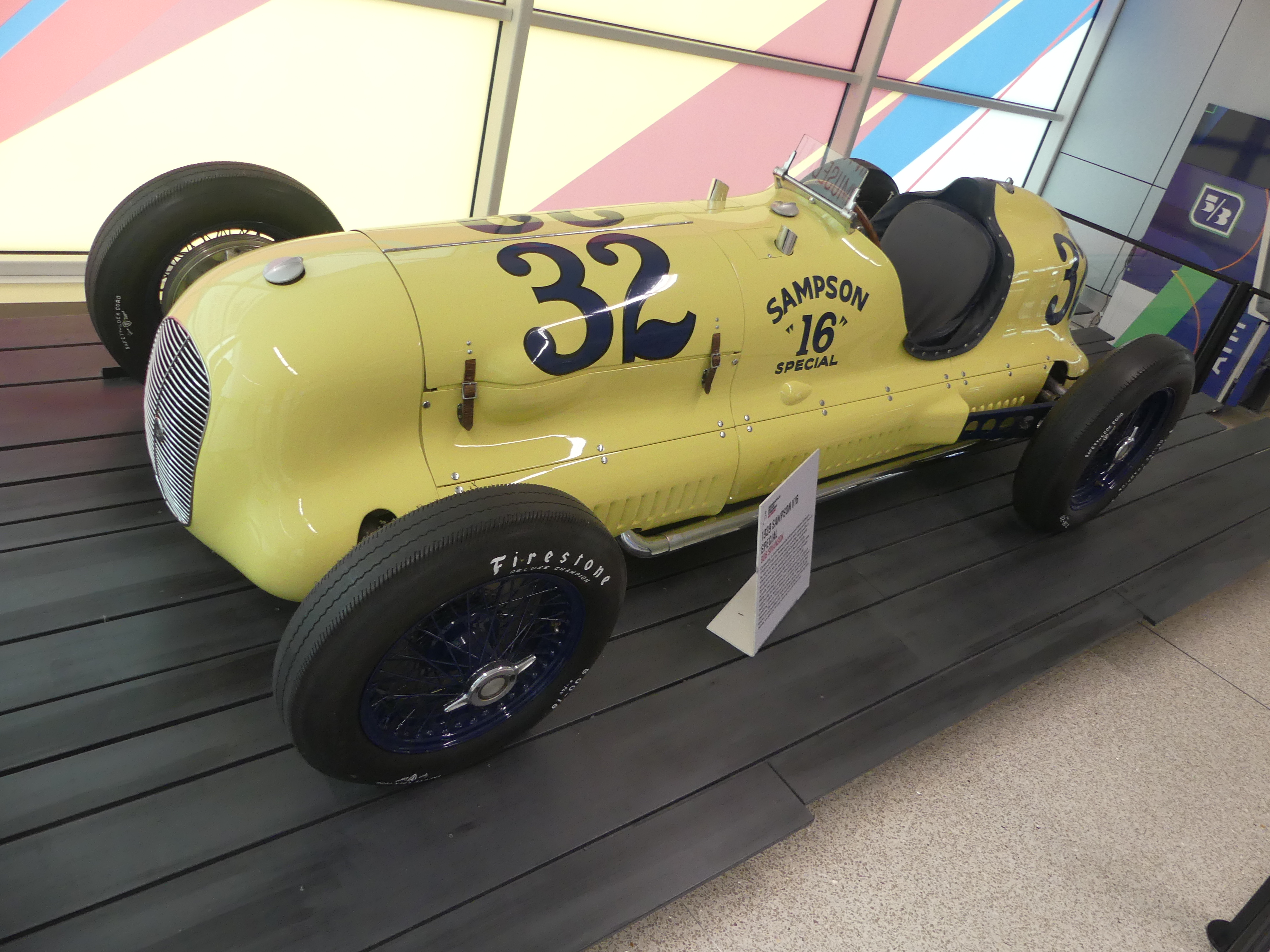This yellow racer is the 1939 Sampson V16 Special. It competed in the Indianapolis 500 several times between 1939 and 1949. The Sampson Special was powered in four of its starts by the same engine used by Frank Lockhart when he lost his life while trying to break the world land speed record on the sands of Daytona Beach in 1928. Developed under Frank’s direction, it was derived from two supercharged 91.5 cubic-inch straight-eight Millers reworked to become a 183-cubic-inch V-16. It was later acquired by Gordon Schroeder, and placed into a chassis built in 1938, by Myron Stevens, and driven to the sixth-fastest qualifying time in 1939, and to sixth in the 1940 race by Bob Swanson. Sponsored in 1946 by Spike Jones, the zany band leader, it was qualified for the outside of the front row by Sam Hanks, with Lockhart’s 18-year-old engine still in the car.