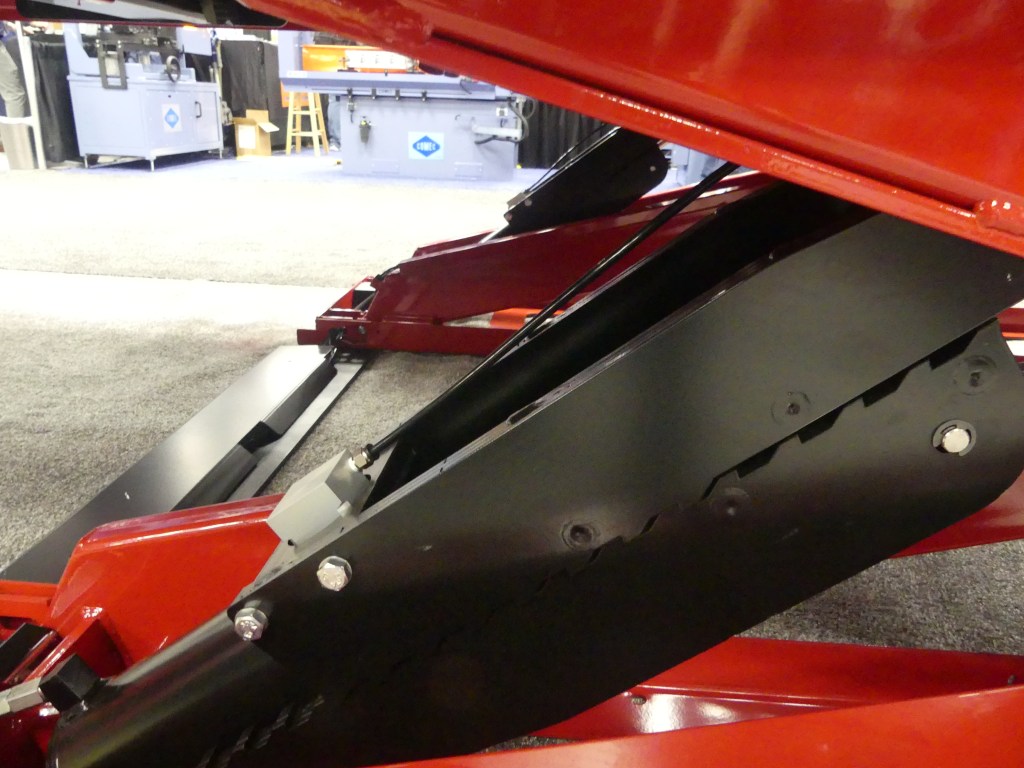 Notice the bump in the rack just ahead of the rear wheels. This is how much higher the scissor lift’s rams are which allows the rack to come down much lower than ever before. This, along with the longer ramps available, allow lower cars to drive up onto the ramp without scraping.